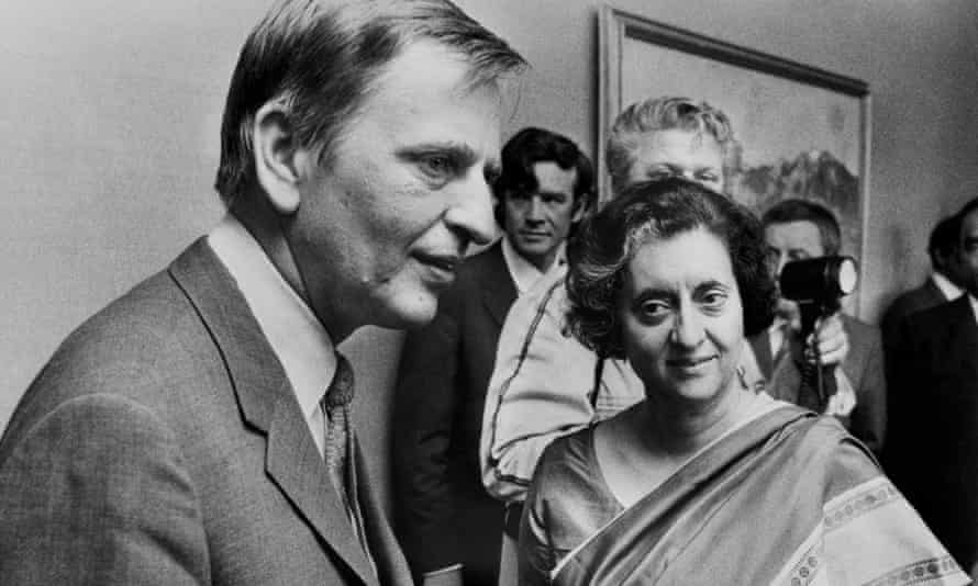 The Indian prime minister, Indira Gandhi, is greeted by her Swedish counterpart, Olof Palme, on the first day of the conference.