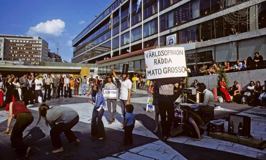 People rally outside the UN conference on the human environment (UNCHE) in Stockholm in June 1972.
