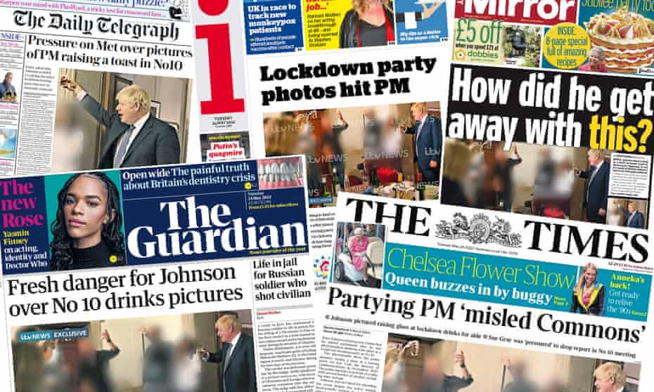 “Fresh danger for Johnson over No 10 drinks pictures”, the Guardian front page reads, alongside a photo of the prime minister raising his glass. The paper reported the Metropolitan police were under pressure too after Johnson escaped a fine despite attending the leaving do for director of communications Lee Cain.