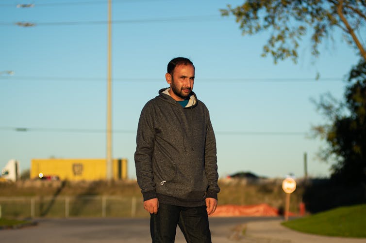 An Afghan refugee stands outside the Mississauga, Ont., hotel where he and his family stayed when arriving from Afghanistan in October 2021.
