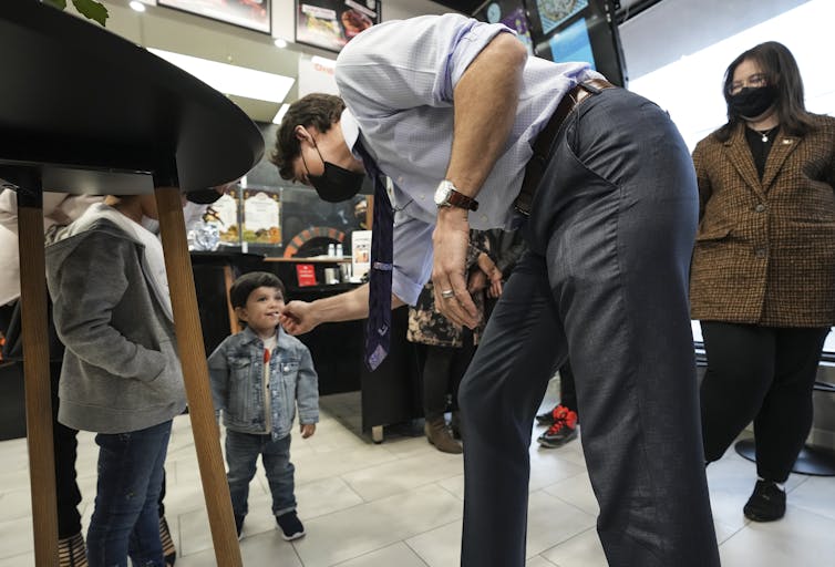 Prime Minister Justin Trudeau playfully reaches for 20-month-old Haris Sadaat’s sucker as he meets with families who have resettled from Afghanistan in Hamilton, Ont., on May 6, 2022. THE CANADIAN PRESS/Nathan Denette