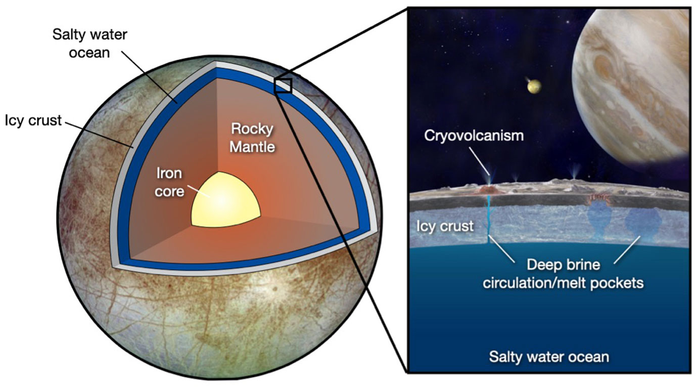 IMAGE: THE LEFT PANEL’S GRAY AND BLUE LAYERS SHOW THE DEEP, ICE-COVERED OCEAN ON EUROPA, A MOON OF JUPITER THAT COULD HOST EXTRATERRESTRIAL LIFE. THIS OCEAN IS THOUGHT TO BE MUCH DEEPER THAN OCEANS ON EARTH. NEW RESEARCH HINTS AT WHERE LIQUID WATER MIGHT BE FOUND IN THESE ENVIRONMENTS. view more