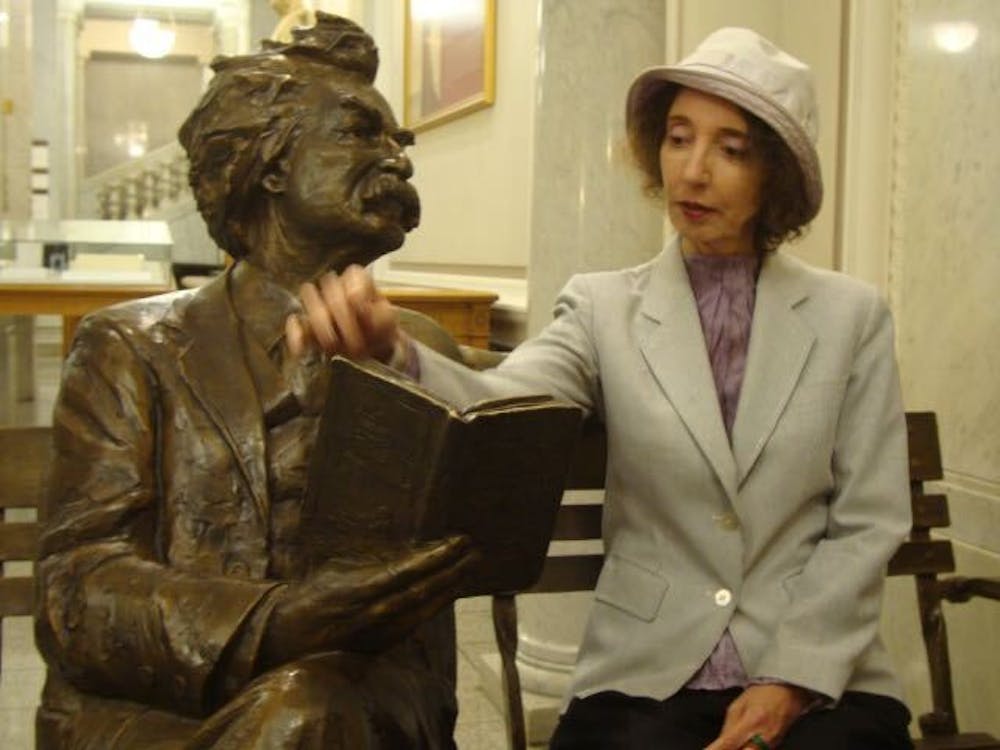 Joyce Carol Oates with a statue of Mark Twain in 2015.