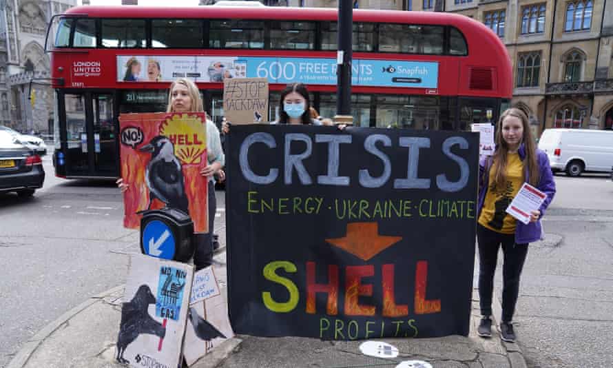 Demonstrators protest outside the Shell AGM in Westminster on Tuesday. Photograph: Stefan Rousseau/PA