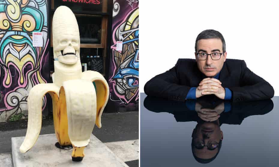 Melbourne’s $22,000 traffic-calming and public-enraging banana sculpture before its attempted decapitation and subsequent removal, and the man who wants to buy it from Yarra city council, US comedian John Oliver. Composite: The Guardian