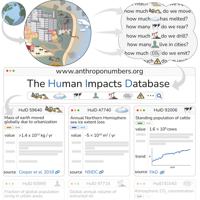 Countless studies have sought to quantify various aspects of human impacts on the planet, but sorting through that data to get answers about the effect we're actually having can be a challenge for researchers, policymakers, and the public alike. A team of researchers has centralized over 300 key figures in the Human Impacts Database, hosted at Anthroponumbers.org. In a paper publishing in the journal Patterns on August 3, the authors outline the kinds of data they have gathered—and how they hope it helps people make sense of the climate crisis.