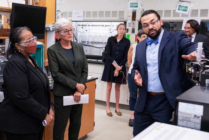 Grant and Award AnnouncementIMAGE: CHARLES MACHAN, AN ASSOCIATE PROFESSOR OF CHEMISTRY, TELLS SECRETARY OF ENERGY JENNIFER GRANHOLM AND ASMERET ASEFAW BERHE, THE ENERGY DEPARTMENT’S DIRECTOR OF THE OFFICE OF SCIENCE, ABOUT THE MOLECULAR PORTION OF THE RESEARCH. view more