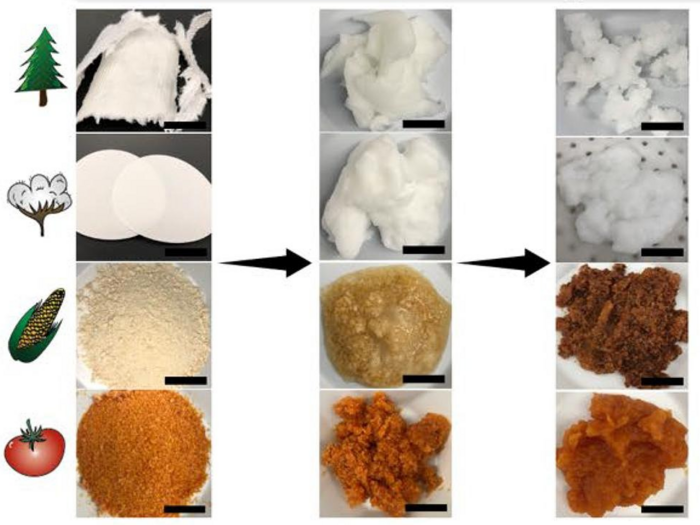 After soaking the materials in water (as shown in middle column), Penn State researchers chemically reacted shredded wood pulp, cotton paper and ground corncob and tomato peels to convert them into microproducts, nanoparticles and solubilized biopolymers (third column). Adding these microproducts or nanoparticles to solutions containing the rare earth element neodymium triggered the separation process, allowing for capture of the neodymium.