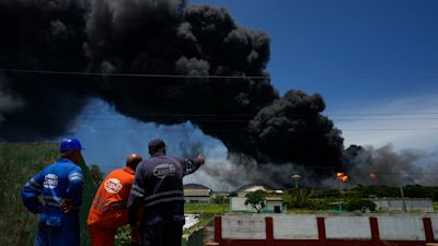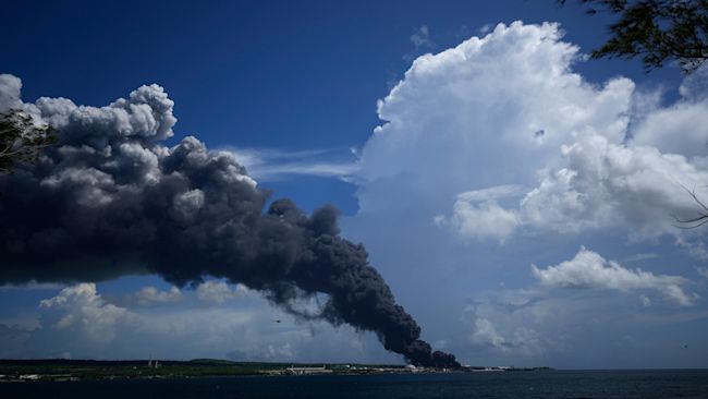 As military helicopters flew overhead dropping water on the blaze, a dense column of black smoke billowed from the facility and spread westward more than 100 kilometres (62 miles) toward Havana.