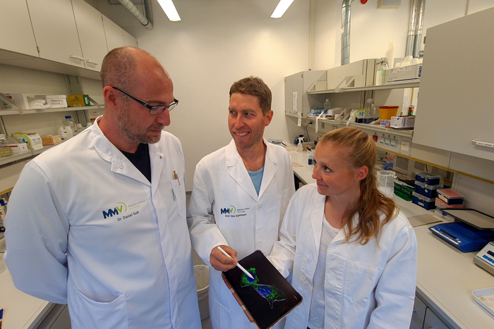 Peer-Reviewed PublicationIMAGE: DANIEL TODT, EIKE STEINMANN AND TONI LUISE MEISTER (LEFT TO RIGHT) LOOK AT THE IMAGE OF A CELL INFECTED WITH THE HEPATITIS E VIRUS. THE CAPSID PROTEIN CAN BE SEEN IN GREEN, THE CELL NUCLEUS IN BLUE. view more