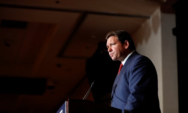 He calls the state of Florida a “citadel of freedom” and says his job as governor is to fight critical race theory, “Faucian dystopia”, uncontrolled immigration, big tech, “leftwing oligarchs”, “Soros-funded prosecutors”, transgender athletes and the “corporate media”.