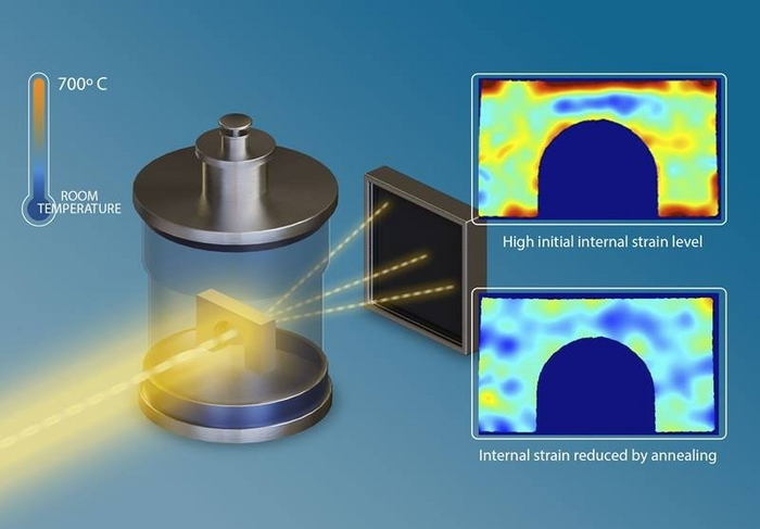 image: Researchers used neutron scattering to measure internal strain in 3-D printed metal samples before (upper right), during, and after (lower right) annealing. Controlling residual strain in laser-printed metal parts helps prevent cracks and failures. view more