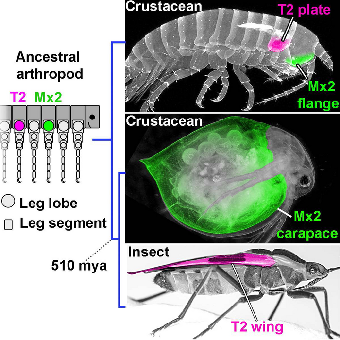 Rather, they propose the ancestral, plate-like leg lobe that evolved into both the wing and the carapace was likely present in the ancestor of all living arthropods. But because the wing and carapace look so different from this ancestral plate, and from other plates in neighboring arthropod lineages, no one realized that they were all the same thing.
