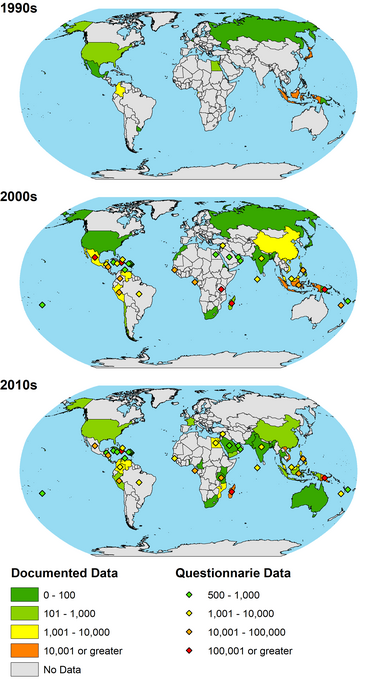 Global maps from the ASU study in Global Change Biology show the magnitude of illegal exploitation by country during the 1990s, 2000s, and 2010s. Data from documented literature are shown by colored countries, while data from the in-country expert online questionnaire are shown with the diamond symbols.
