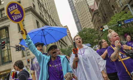 SEIU members shout their support for unions during a Labor Day parade in downtown Pittsburgh, on 5 September. Photograph: Steve Mellon/AP