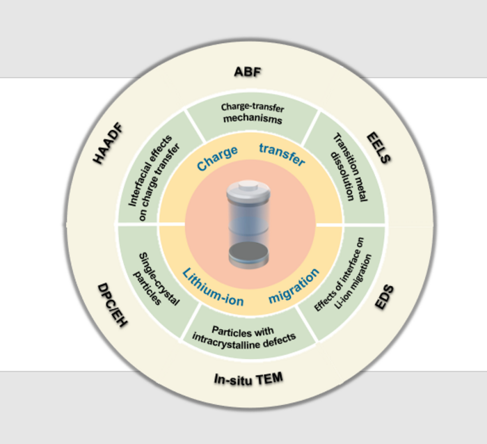 The researchers examined how advanced electron microscopy and the associated characterization techniques can provide different insights into how, for example, lithium ions migrate in the battery to produce charge or how charge transfer can trigger energy use. They specifically focused on transition metal dissolution and charge transfer mechanism in the charging-discharging process of lithium-ion battery positive electrodes; the structure and evolution of cathode-electrode interfaces and solid electrolyte interphase during long-term cycling; and the effect of electrode structure and interface on lithium-ion migration.