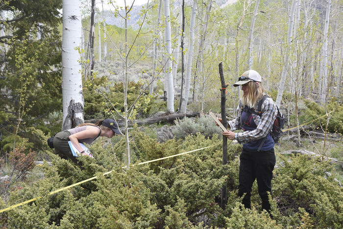 Field Technicians Rebekah Adams and Etta Crowley take vegetation measurement under Pando, the world’s largest living organism. A recent evaluation of the massive aspen stand in south-central Utah found that Pando seems to be taking three disparate ecological paths based on how the different segments are managed.