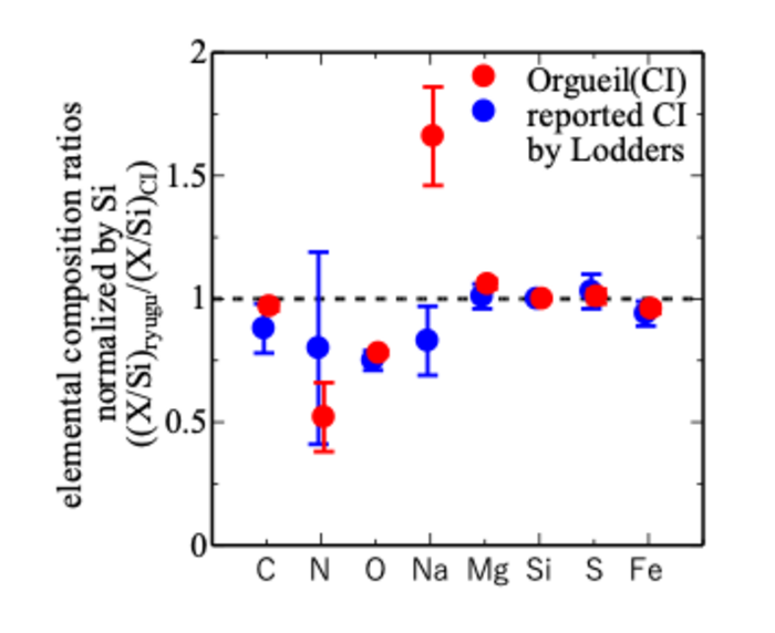 Figure 4: Comparison of the elemental composition of asteroid Ryugu sample and CI chondrite Orgueil (K. Lodders, The Astrophysical Journal, 591, 1220-1247, 2003). The oxygen x-ray shows the Ryugu sample’s oxygen abundance relative to silicon was less compared to CI chondrite.