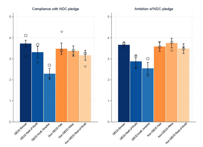 Surveys where respondents were asked to rate their home country were categorized by continent to elicit the most candid responses possible. In this analysis, experts from North American countries were the most pessimistic about their pledges, both in their drive and ability to achieve climate goals in the agreement.
