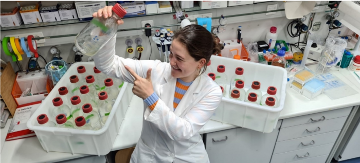 Nevena Maslać with batch cultures of Methanothermococcus thermolithotrophicus in the Microbial Metabolism lab, which allow for precise testing of different growth conditions in complete absence of oxygen.