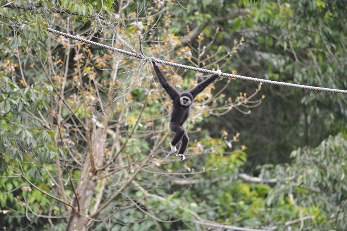 Gibbon (Hylobates lar) brachiating across a single-line canopy bridge in Khao Yai National Park, Thailand.