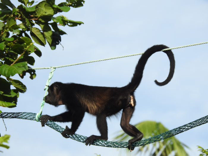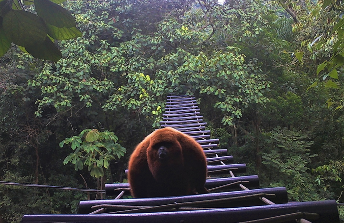 IMAGE: FEMALE HOWLER MONKEY (ALOUATTA PALLIATA PALLIATA) USES A CANOPY BRIDGE IN PLAYA HERMOSA, COSTA RICA WITH AN INGENIOUS DESIGN TO SUPPORT PREHENSILE TAIL USE. view more