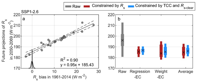 (a) The relationship between the future Rs during 2050-2069 in SSP1-2.6 (a low-emission scenario) and the historical bias in Rs during 1961-2014 for the 24 models. (b) Comparisons of raw and constrained projections of Rs in SSP1-2.6. Rs projections are constrained by the historical bias in Rs (red bars) and the historical bias in TCC and Rs-clear, respectively (blue bars). Photo credit: Yanyi He and Kun Yang.