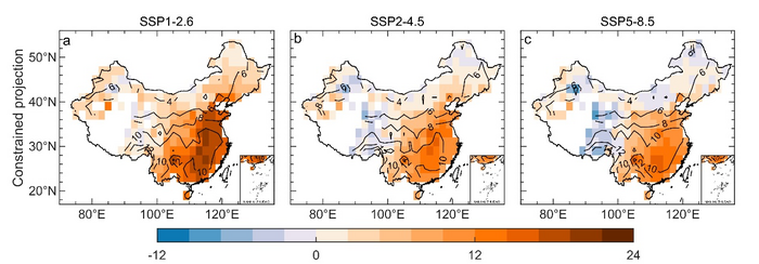 Future changes (shading; in W•m-2) in the 20-year mean of Rs during 2050-2069 relative to the 1995-2014 mean from constrained values in three possible future scenarios, i.e., SSP1-2.6 (a), SSP2-4.5 (b) and SSP5-8.5 (c), with the 66% confidence interval shown as contour. Photo credit: Yanyi He and Kun Yang.