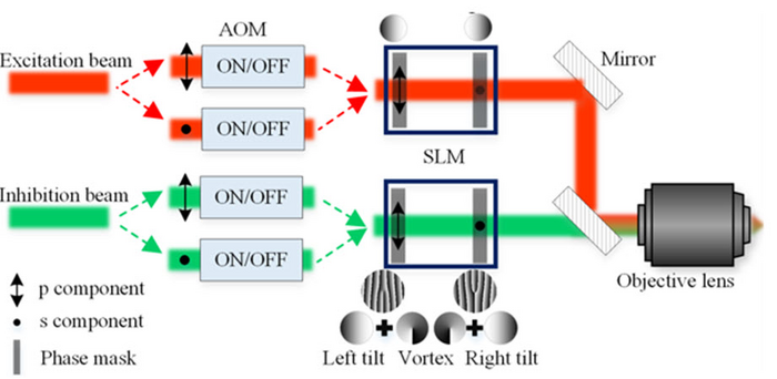 The P3L system consists of a physical arrangement of eight modules. The system begins with two printing channels, consisting of an excitation solid spot and a doughnut-shaped inhibition beam. The two beams are first stabilized and are then split into two sub-beams using a polarization filter. This allows the individual on–off control of each sub-beam through an acoustic-optical modulator. Next, the two sub-beams are recombined to regain the excitation and inhibition beams. The beams are then modulated using spatial light modulators. Finally, the two beams are combined and passed through a microscope, after which they focus on the substrate as two spots.