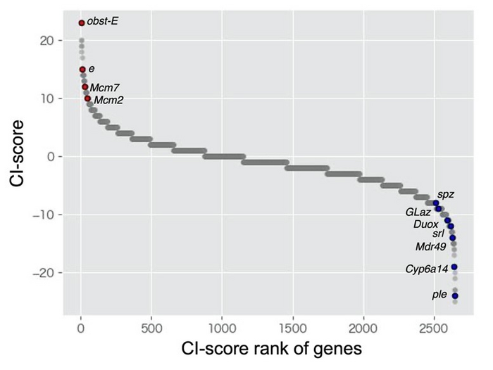 Scatter plots of CI-score of all genes (2652 genes) identified in this study.