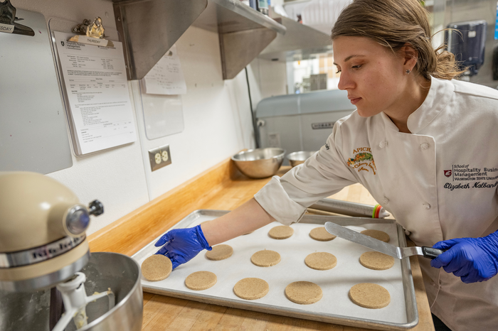 IMAGE: ELIZABETH NALBANDIAN, STUDY FIRST AUTHOR AND WSU FOOD SCIENCE GRADUATE STUDENT, PREPARES SOME SUGAR COOKIES MADE WITH QUINOA FLOUR FOR BAKING. view more