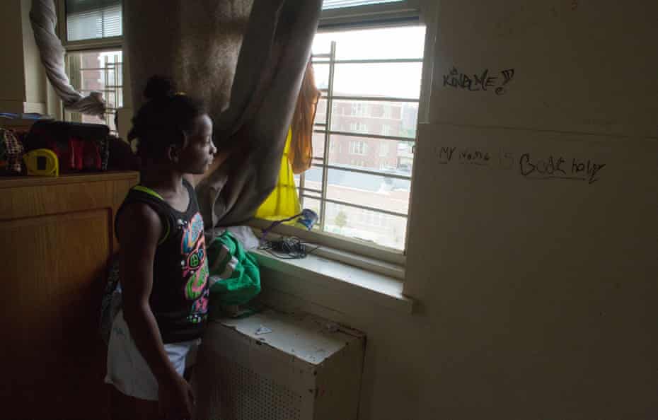 Dasani opens a heavy metal door, stepping into the dark corridor. She is sure the place is haunted. Auburn used to be a hospital, back when nurses tended to the dying in open wards. Dasani’s room was “where they put the crazies”, she says, citing as proof the broken intercom on the wall. Right outside is a communal bathroom with a large industrial tub. A changing table for babies hangs off its hinge. Mothers shower quickly, posting their children as lookouts for the building’s predators.