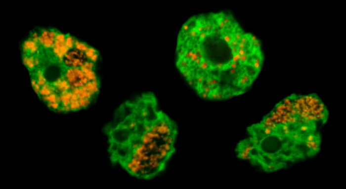 Peer-Reviewed PublicationIMAGE: CHLAMYDIAE, KNOWN AS BACTERIAL PATHOGENS OF HUMANS, ORIGINALLY EVOLVED IN SINGLE-CELLED MICROORGANISMS LONG BEFORE GAINING THE ABILITY TO INFECT HUMANS. THE IMAGE SHOWS SOIL AMOEBA (LABELED IN GREEN) AND THEIR CHLAMYDIAL SYMBIONTS (LABELED IN ORANGE). view more