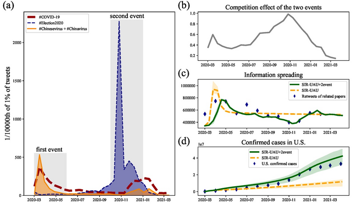 Taking the United States as an example, the authors use three real data sets to compare with the model, including the confirmed data of the United States, the topic data of Twitter, and the forwarding of scientific literature on Twitter. The research team found that their model was consistent with the behavaior of all the three data sets at the same time. Specifically, two specific major events explain the trend of the coronvarius epidemic in the United States: the international online agenda setting of Donald Trump in early stage of the epidemic, and, the 2020 U.S. Presidential Election. These events coincided with a worsening of infection in the United States. Research shows that major social events during the epidemic period will lead to the disturbance of scientific information dissemination, and will increase the prevalence of infection. Their theoretical model provides a mechanism for the distraction of attention and dilution of information propagation in response to an epidemic.