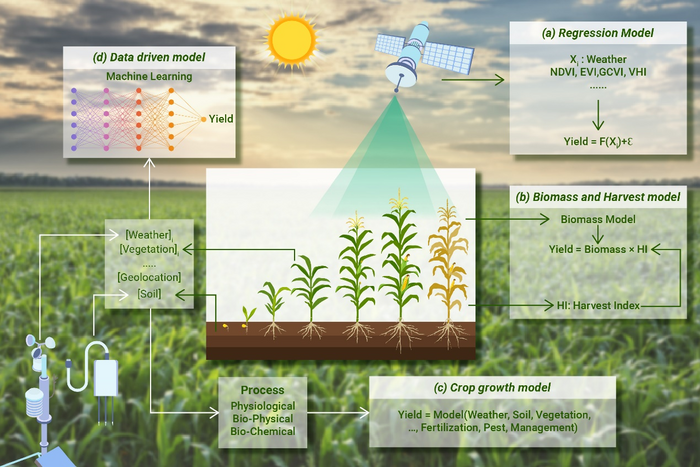IMAGE: (A) REGRESSION METHOD WITH INPUTS OF WEATHER FACTORS AND VEGETATION INDICES; (B) IS BIOMASS AND HARVEST INDEX MODEL; (C) IS A CROP GROWTH MODEL WITH INPUT OF WEATHER, SOIL, VEGETATION, FERTILIZATION, PEST AND MANAGEMENT CONDITIONS; (D) IS THE EMERGING DATA-DRIVEN MODELS WITH SUPPORT OF MACHINE OR DEEP LEARNING METHODS. view more