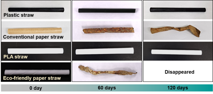 The newly developed straws decompose well, even in the ocean. In general, paper or plastic decomposes much more slowly in the ocean than in soil because of the ocean’s low temperature and high salinity, which impede growth of microbes. The research team performed a decomposition test in a marine environment by immersing the straw samples at a depth of 1.5–2 m on the coast near Pohang, South Korea.