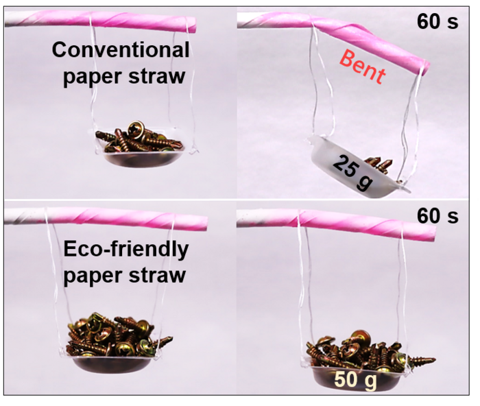 The research team found that these eco-friendly paper straws maintain their physical integrity in not only cold drinks but also hot drinks. The team also found that the straws did not become soggy when used to stir various beverages such as water, tea, carbonated drinks, milk, and other drinks containing lipids, or upon prolonged contact with liquids. The degree of sogginess of the as-prepared paper straws and conventional paper straws was compared. The conventional paper straw was severely bent when a weight of approximately 25g was suspended after the straw was dipped in cold water at 5°C for 1 min. In contrast, the as-prepared paper straw did not bend as much even when the weight was more than 50g under the same conditions.