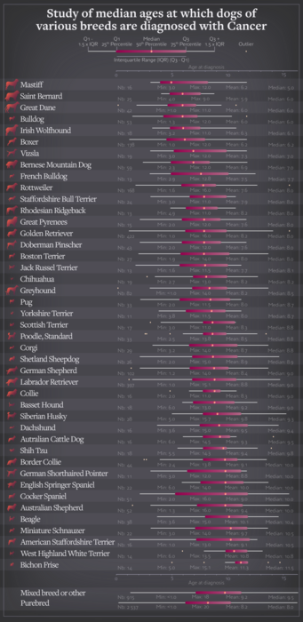 In this article, researchers studied the median age at which a number of dog breeds are diagnosed with cancer. Of the 43 breeds represented, Mastiffs had the youngest median age at cancer diagnosis (5 years), while Bichon Frises had the oldest median age (11.5 years). The median age of cancer diagnosis was also seen to be lower for purebred dogs than for mixed breed dogs. The median age found for each breed may assist in establishing the age at which cancer screening should be initiated for individual dogs, to increase likelihood of early detection and treatment. Note: For display purposes, outliers are not presented for bars comparing purebred and mixed breed dogs.