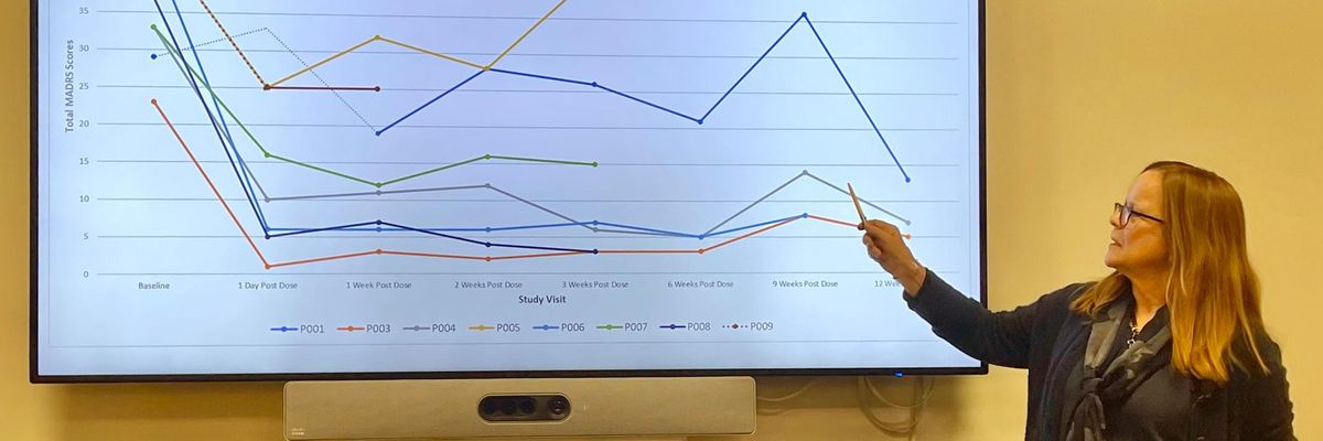 Trisha Suppes, founder of the Bipolar and Depression Research Program at the Palo Alto VA Medical Center in California, points during a November 4, 2022 presentation to what she called "stunning" results showing a reduction in treatment-resistant depression among patients undergoing psilocybin therapy.