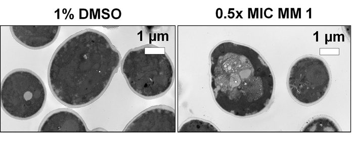 CAPTION: Ultrastructural changes induced by light-activated molecular machines in the fungus Candida albicans, detected by transmission electron microscopy, compared to a solvent control (1% dimethyl sulfoxide). (Image courtesy of Matthew Meyer, Electron Microscopy Facilities/Rice University)