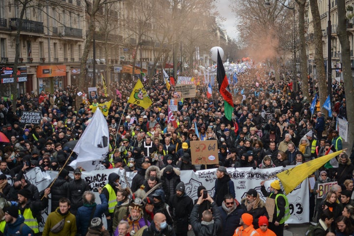 Over 960,000 people marched in Paris, Nice, Marseille, Toulouse, Nantes and other cities, according to the Interior Ministry. Protesters hoped to keep up the pressure on the government to back down, and further action is planned for Feb. 16.