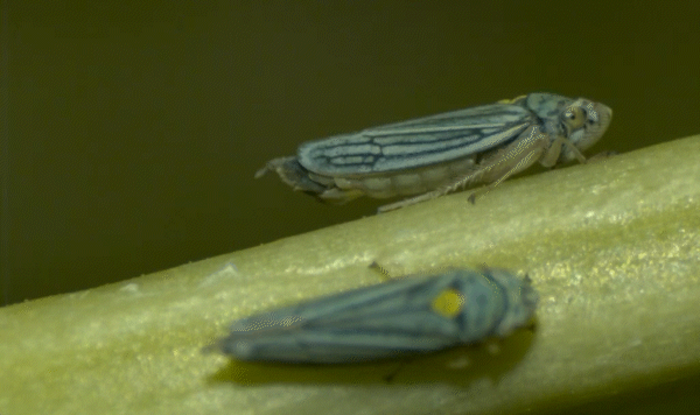 Two sharpshooters on a plant, urinating in droplets (full-speed GIF).