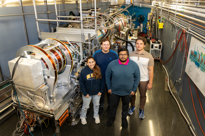 IMAGE: FROM LEFT ARE UWINDSOR STUDENTS ISABELLE DIB, DOMINIK DZIURA, STUART CASTILLO AND MAKSYMILIAN DZIURA AT ORNL’S NEUTRON SPIN ECHO SPECTROMETER. THEIR WORK ADVANCES STUDIES ON A NATURAL CANCER TREATMENT. view more