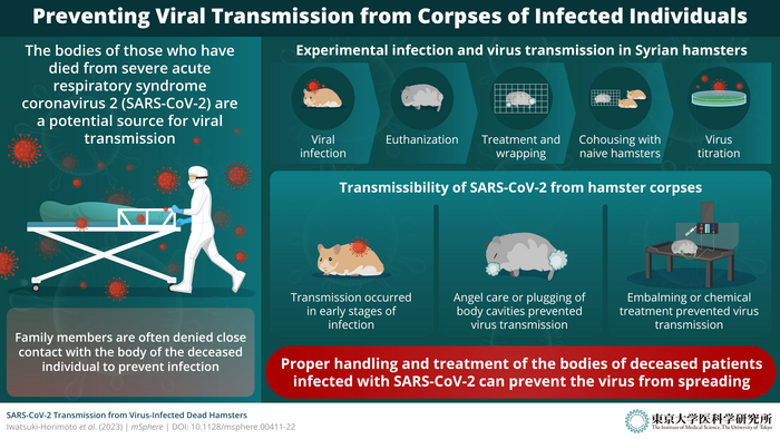 To fill this knowledge gap, a research team from Japan has analyzed the possibility of SARS-CoV-2 transmission from a deceased individual's body by using a hamster model. They analyzed whether the virus can spread from COVID-19-infected dead hamsters, and whether this spread can be reduced by using angel care and embalming. Their recent work was published in mSphere on 10 January 2023. Sharing the motivation behind their investigation, Prof. Kawaoka states, “It has been two and a half years since the COVID-19 pandemic began, and the transmissibility of SARS-CoV-2 from the body of a deceased, infected person still remains unclear.”
