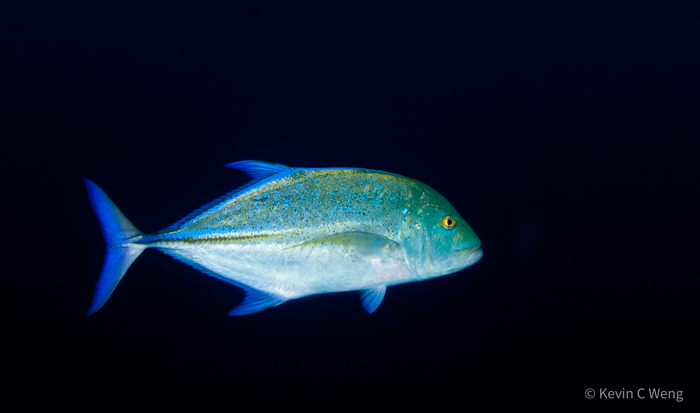 The Bluefin trevally or omilu (Caranx melampygus) is one of the fast-swimming predatory fishes that increased their use of Molokini's shallow habitats during the COVID lockdown. © K. Weng/VIMS.
