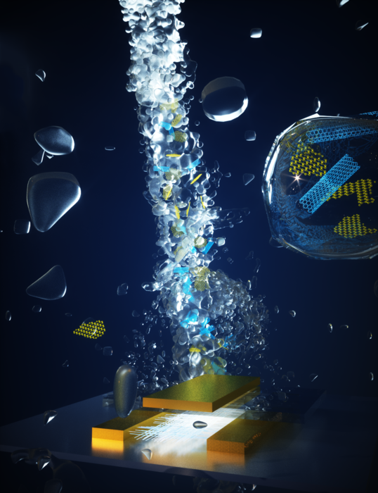 An artistic depiction of the new process that allows printers to create fully functioning, fully recyclable transistors using only water instead of harsh chemicals.