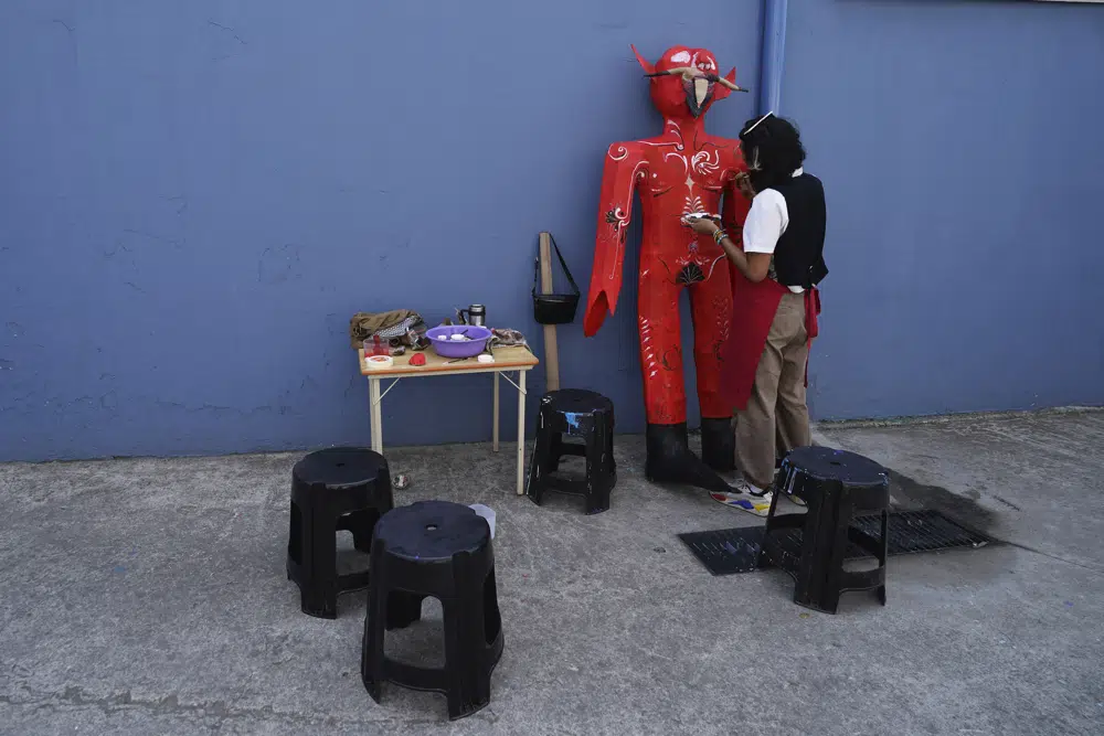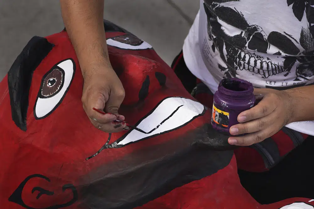 Artist Gabriel Gutierrez paints a version of Judas that he is crafting for the "Burning of Judas," celebration, at the Santa Maria La Ribera Cultural Center, in Mexico City, Wednesday, April 5, 2023. The annual celebration takes place in Mexico every Holy Saturday, when people across the country gather in public plazas to light fireworks that will destroy the colorful figures representing symbolic embodiments of evil.