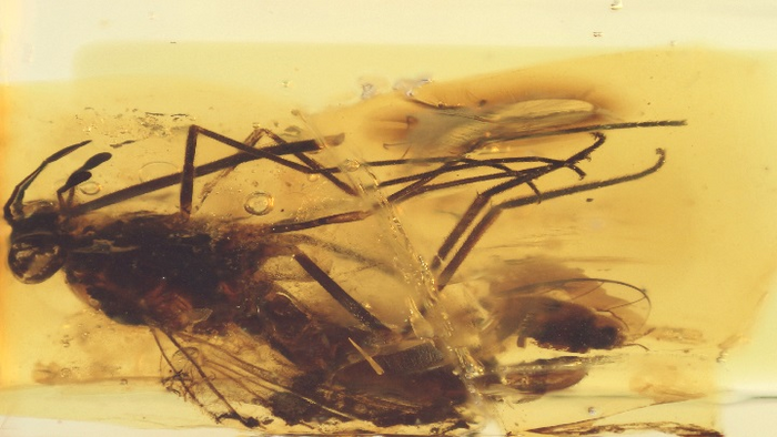 An insect of the species <i>Buccinatormyia magnifica</i> from the extinguished family <i>Zhangsolvidae</i> (<i>Diptera</i>), El Soplao (Spain).