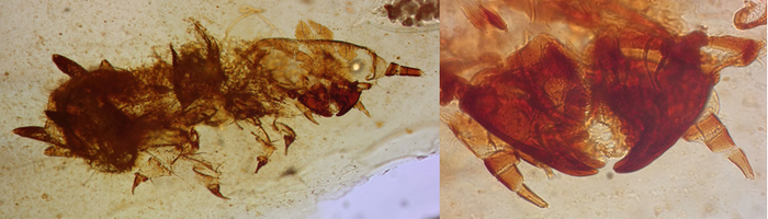 Isolated moult of the feather-feeding beetle larva found in the Spanish amber outcrop of Rábago/El Soplao, with detail of its powerful mandibles (left). Length of the moult is less than two millimetres.