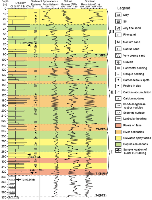 The sedimentary filling and depositional cycle of the basin has strong response to the episodic pull-apart and extension of the basin. Before the intense pull-apart, a thin layer of Miocene mudstone slowly accumulated in the basin due to local rifting. In the early and late stages of pull-apart and extension, the basin was successively filled with coarse-grained alluvial fan facies (sedimentary system I) and braided river-meandering river facies (sedimentary system II) with frequent facies changes. During the subsidence stage of post-pull-apart, the basin was filled with a set of floodplain facies deposits (sedimentary system III).